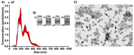 (A) The size distribution of A549-derived exosomes showed sharp peaks at 187 nm. The concentration of exosomes was 8 × 108 particles·mL−1 based on NTA analysis (the samples were diluted 1:5 in PBS). (B) For Western Blot analysis, exosomes were loaded on SDS-PAGE and immunoblotted for antibodies against tetraspanins (anti-CD9, anti-CD63, and anti-CD81) and anti-EGFR. A gel was run under non-reducing and reducing conditions with 2 × 108 particles: ~5 µg. The exposure time was 80 s. (C) TEM images of isolated exosomes from cell culture supernatant are shown (scale bar: 200 nm). The extracted exosomes displayed perfect integrity with an average size of 100 nm.