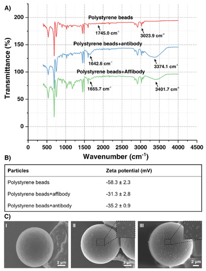 The chemical composition of the carboxylate polystyrene bead functionalized with antibody and carboxylate polystyrene bead functionalized with Affibody was analyzed by Fourier-transform infrared spectroscopy (FT-IR) (MIRacle 10, Shimadzu, Kyoto 604-8511, Japan). FT-IR spectra were acquired across a 4000–400 cm−1 range at a resolution of 4 cm−1 and by averaging 16 scans for each spectrum three times. The Zeta potential of unconjugated carboxylate polystyrene microbeads and polystyrene microbead conjugated with Affibody and antibody were determined with a Zetasizer Nano ZS (Malvern, WR14 1XZ, UK) equipped with a ZET 5104 cell. Measurements were recorded at 25 °C suspended in Milli-Q water. Each zeta measurement was taken at several acquisitions automated by the machine to assess precision in measurements.