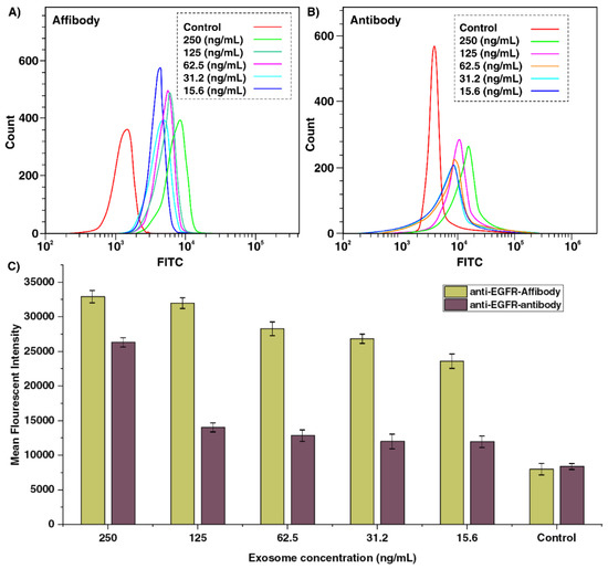 To determine the AffiBeads probe capture efficiency for EGFR-expressing exosomes and compare it with its antibody counterpart, we used immobilized anti-EGFR Affibody/antibody on the carboxylate polystyrene microbeads previously functionalized with EDC and evaluated it with flow cytometry and fluorescent microscopy. EDC chemistry has been employed as an approach in the covalent attachment for the immobilization of proteins as well as a method for the preparation of substrates. In brief, the carboxylate polystyrene beads were activated by washing twice with 50 mM MES (2-(N-morpholino) ethane sulfonic acid) buffer (pH = 5.7). After washing, the beads were co-incubated with 24 µL of 200 mM EDC in 1 mL of 50 mM MES buffer (pH = 5.7) for 30 min at room temperature on a rotary wheel. After two times washing with MES buffer (pH = 5.7), 1 mg of functionalized polystyrene microbeads were co-incubated separately with 1.5 µg of anti-human EGFR Affibody (10.1886.01.0001, Sweden) and anti-human EGFR antibody (352,902, BioLegend, USA) dissolved in 250 µL of PBS buffer (pH = 7.4) and incubated at room temperature for 4 h with constant mixing. The optimum time of Affibody/antibody incubation with the functionalized beads and the concentration of Affibody/antibody needed for the saturation of beads, and consequently achieving the signal in flow cytometry, was characterized in our previous study [34]. In the final step, washed beads were resuspended in 1 mL of quenching solution containing 40 mM glycine and 0.05–1% (w/v) BSA. After incubation, microbeads were washed 3 times with PBS throughout the centrifugation steps. In the next step, the 1 × 107, 5 × 106, 2.5 × 105, 1.25 × 105, and 6.25 × 105 concentrations of exosome particles (corresponding to 250 ng·mL−1, 125 ng·mL−1, 62.5 ng·mL−1, and 31.2 ng·mL−1, and 15.6 ng·mL−1 total exosome protein amount), which are equivalent to 200, 100, 50, 25, and 12 exosomes per bead for 50,000 microbeads, were co-incubated separately with AffiBeads and antibody-coated beads for 18 h at 4 °C without agitation, and a control group using BSA instead of exosomes was also processed. After incubation, the tubes were subjected to centrifugation at 3000× g for 5 min to remove excess non-reacted exosomes and wash twice with PBS. The complexes containing AffiBeads/antibody-coated beads and the exosome were then co-incubated with the labeled detection anti-EGFR-FITC (10.1886.03.0001, Sweden) Affibody/anti-EGFR-Alexa Fluor 488 antibody for 90 min at 37 °C. Next, the mentioned complexes were washed 3 times with PBS using centrifugation at 3000× g for 5 min and were re-suspended in 1 mL of PBS for flow cytometry analysis (CytoFLEX LX, Beckman Coulter, Brea, CA, USA). Samples were run for approximately one minute, and 10,000 events were acquired. Gates were set on the bead fraction visible in the FSC/SSC light scatter. The percentage of positive microbeads was measured, and a histogram was drawn for all the polystyrene microbeads functionalized with antibody versus polystyrene microbeads functionalized with Affibody using CytExpert software.