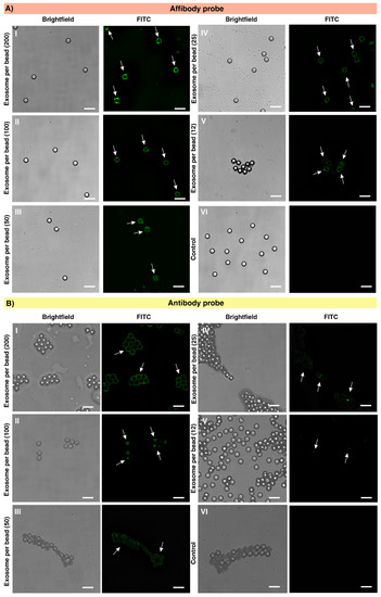 The results of fluorescent microscopy reveal that at the lowest exosome concentration, 15.6 ng·mL−1 ~12 exosomes per bead, the signal above the background threshold was detected in both antibody and Affibody platforms (Figure 6A,B(I–VI)). These results are consistent with the flow cytometry data gathered and highlighted the high capture efficiency of the AffiBeads probe for the highly sensitive detection of low numbers of EGFR-expressing exosomes.