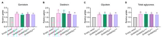 To assess the potential enhancement of isoflavone accumulation by increasing GmMATE1 expression, GmMATE1C08 was overexpressed in soybean germplasm W82. A statistically significant enhancement in total isoflavones (genistein, daidzein, glycitein, genistin, daidzin, glycitin, malonylgenistin, malonyldaidzin, and malonylglycitin) was observed (Figure 5), suggesting an overall improvement in isoflavone accumulation.