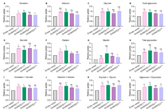 Yeast uptake assay with a mixture of genistin, daidzin, and glycitin. Metabolites were extracted from the yeast after feeding for 24 h and analyzed using UPLC against the respective standards. It appeared some of the glycosides were converted to aglycones in the yeast by endogenous enzymes. Values obtained from the yeast expressing GmMATEs were normalized to those from the empty vector control (EV) in the same experiment. The relative uptake levels of individual isoflavone species (A–C,E–G) and different isoflavone combinations (D,H,I–L) were determined. Total aglycones (D) refers to the combination of genistein, daidzein, and glyciteins. Total glycosides (H) refers to the combination of genistin, daidzin, and glycitin. The relative uptake level of total aglycones and glycosides is shown in (L). Values shown are the mean of six independent experiments ± SEM. Significant differences compared to EV were determined by Mann-Whitney test. *, p < 0.05; **, p < 0.01; ns, not significant.