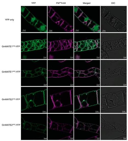 Subcellular localizations of GmMATE1-YFP and GmMATE2-YFP were determined using confocal microscopy. The cells were incubated with FMTM4-64 in the dark at room temperature for 24 h before imaging. DIC, differential interference contrast. Signals from GmMATE-YFP and FMTM4-64 were illustrated in green and magenta, respectively.