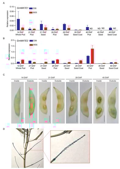 Relative expressions of GmMATE1 and GmMATE2 in different tissues within the developing soybean seed pod. The relative expression of (A) GmMATE1 and (B) GmMATE2 in different tissues of the developing pod, normalized to the reference gene, VPS, using the 2−ΔCt method. DAF, days after flowering. Values shown are the averages of three technical replicates ± SEM. Similar expression trends were obtained in another biological repeat. (C,D) Photos showing the GUS staining of (C) transgenic soybean pods and (D) transgenic A. thaliana expressing β-glucuronidase (GUS) driven by the native GmMATE1C08 promoter. Similar results were obtained from two independent transgenic lines. Scale bar = 1 cm.