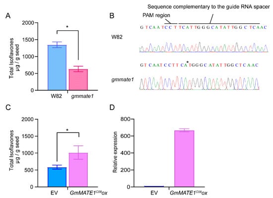 A guide RNA, targeting the first exon of GmMATE1, was used to generate knockout mutants in the soybean germplasm, Williams 82 (W82). After screening, mate1 knockout lines were generated in the W82 background (Figure 5). The allelic form of GmMATE1C08 is the same as that of W82. After propagating to the next generation, we obtained a homozygous GmMATE1 mutant in W82, carrying a single-nucleotide deletion of the gene, causing frameshift and resulting in the truncation of the protein product (Figure 5). Significantly lower total isoflavone contents were detected in the knockout mutant compared to the wild type (Figure 5).