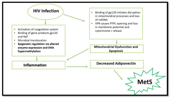 Summary of processes involved in MetS promotion via HIV infection. HIV infection can cause mitochondrial dysfunction, apoptosis, epigenetic changes, and inflammation, resulting in decreased adiponectin expression. Consequently, MetS initiation occurs. (gp120—envelope glycoprotein GP120; Nef—negative factor; DNA—deoxyribonucleotide acid; mtDNA—mitochondrial DNA; VPR—viral protein R; PTPC—permeability transition pore complex).