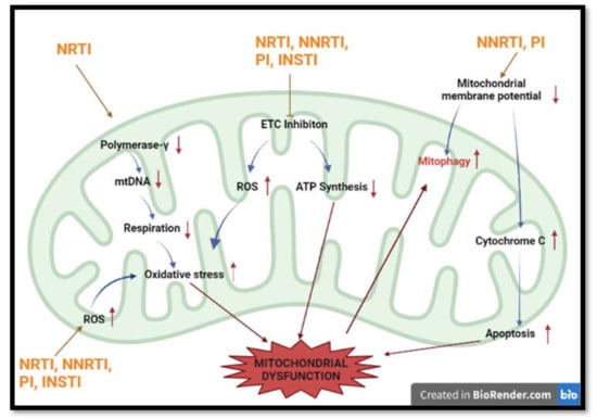 The first observed effects of ARVs on the mitochondria were seen with NRTI use (Figure 3). NRTIs inhibit polymerase-γ, which has a role in mitochondrial DNA replication, thus compromising mitochondrial integrity [83]. Furthermore, NRTIs prevent ATP/ADP translocation. This causes impairment in respiration and ATP synthesis [84,85]. Studies show that decreases in mitochondrial DNA (mtDNA) content were linked to changes in respiration. The reduction in mtDNA initiates impairment in oxidative phosphorylation (OXPHOS) proteins and increases oxidative stress in mitochondria. This results in damage to mitochondrial proteins and lipids, further impairing mitochondrial function [86].