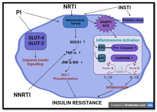 Furthermore, PIs are the most common ARVs associated with insulin resistance. PIs may induce insulin resistance through their effects on mitochondrial dysfunction, glucose transport, and inflammation induction. Upon mitochondrial damage or dysfunction, an increase in ROS is observed. This signals for an immune response via the action of the NALP3 inflammasome [66,67] (Figure 4). Inflammasomes are responsible for the clearance of pathogens and damaged cells. Furthermore, mitochondrial DAMPs such as mtDNA and DRP-1 may be released upon mitochondrial damage and are associated with inflammasome activation. The activation of inflammasomes promotes the release of caspase 1, which activates pro-inflammatory cytokines (IL-1β and IL-18). IL-1β was strongly linked with insulin resistance and impaired insulin secretion [68,69,70].