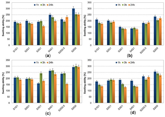 Effect of hydrogel composition on swelling degree after immersing in (a) distilled water at ambient temperature; (b) distilled water at 37 °C; (c) PBS at ambient temperature; (d) PBS at 37 °C (n = 3).