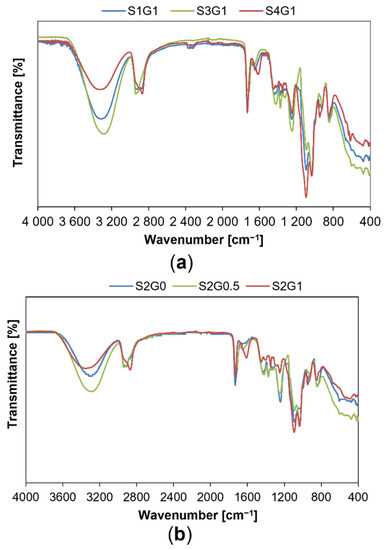 Figure 3 compiles the FT-IR spectra of the obtained hydrogels, with Figure 3a showing a summary of the spectra of materials obtained using varying contents of the base matrix components (SA and PVA) with a constant glycerin content (3.4% (v/v), while Figure 3b collates the spectra of materials with a constant proportion of alginate and poly(vinyl alcohol), but with varying glycerin content (or none, as a control) in the hydrogel matrix.