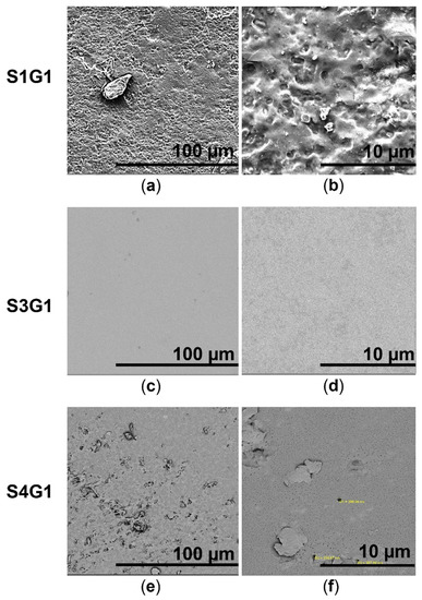 SEM images of hydrogels containing a constant amount of glycerin, such as 3.4% (v/v); (a,b) sample S1G1; (c,d) sample S3G1; (e,f) sample S4G1.