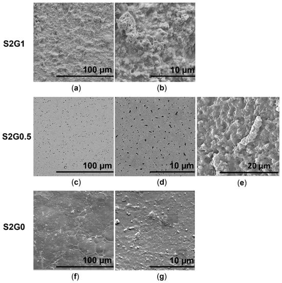 SEM images of hydrogels containing a different glycerin content: 0; 1.7 and 3.4% (v/v); (a,b) sample S2G1; (c,d) sample S2G0.5; (e) cross-section of sample S2G0.5; (f,g) sample S2G0.