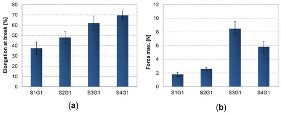 Stretching tests clearly showed the impact of the hydrogels’ compositions on their mechanical properties. All of the tested membranes were characterized by a medium maximum deformation rate of around 37.6–69.5% at break. Importantly, with a constant SA-to-PVA volume ratio, elongation at break increases monotonically with an increasing concentration of both components. As shown in Figure 7, higher elongation at break values were observed in the S4G1 and S3G1 systems, which was closely related to a higher content of PVA leading to an increase in the strength of the polymeric network. It is noteworthy that when the 10% of PVA solution was introduced into the hydrogel system, the elasticity was approximately 24% higher than for samples with 5% of PVA. Moreover, these results are consistent with the measurements of the gel fraction, where the elasticity of the samples increased with an increasing share of the insoluble fraction of hydrogels. This can be explained as being because an effective crosslinking process, expressed by the GF value, leads to the formation of a mechanically stable polymer network with a higher deformation at break value. Furthermore, the stretching test revealed that samples S3G1 and S4G1 containing a greater concentration of PVA showed higher tensile strength, where the highest stress at a break value of around 8.3 N was noted for a matrix with 1.5% of sodium alginate and 10% of poly(vinyl alcohol). Thus, these results suggest that a lower crosslink density of obtained hydrogel systems weakened the tensile strength properties.