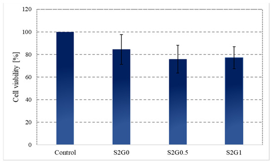 Cytotoxicity analysis performed on an in vitro model indicates that the tested samples did not show a toxicity effect towards normal human dermal fibroblasts. Some small differences were observed in the proliferating fraction of cells for sample S2G0 without glycerin and with 1.7% and 3.4% of glycerin. Namely, the addition of glycerin had a negative impact on the proliferation. However, this dependence was barely noticeable. In general, none of the tested samples inhibited the proliferation of the tested cell line significantly, as evidenced by the plot (Figure 8) in which the surviving fraction exceeds 75%. Additionally, it is worth adding that we compared the cells seeded on the culture dish (control) to cells seeded on tested samples. Culture dishes are purposed for cell culturing, and it is clear that the conditions would be better than on tested materials. The positive effects of the PVA/chitosan with glycerin on the growth of L929 cells are also reported by Yang et al. [57]. They found that the morphologies of cells treated with prepared hydrogels were unchanged as compared with the negative samples. Moreover, they demonstrated increased cell proliferation after 48 h incubation.