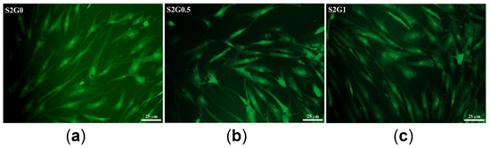 Fibroblast cells stained with CellTracker Green attached to the surface of the hydrogel discs; (a) sample S2G0; (b) sample S2G0.5; (c) sample S2G1. Scale bars indicate 25 µm.