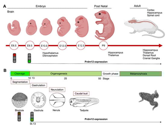 - Rahman, M.; Kim, I.; Ahn, D.; Tae, H.; Park, B. PR domaincontaining protein 12 (prdm12) is a downstream target of the transcription factor zic1 during cellular differentiation in the central nervous system: PR domain containing protein is the right form. Int. J. Dev. Neurosci. 2020, 80, 528–537. [Google Scholar] [CrossRef] [PubMed]