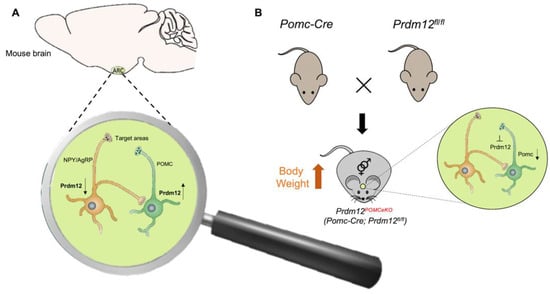 - Hael, C.E.; Rojo, D.; Orquera, D.P.; Low, M.J.; Rubinstein, M. The transcriptional regulator PRDM12 is critical for Pomc expression in the mouse hypothalamus and controlling food intake, adiposity, and body weight. Mol. Metab. 2020, 34, 43–53. [Google Scholar] [CrossRef] [PubMed]