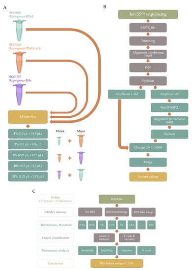 Schematic representation of our workflow. (A) Wet lab approach to performing the 15 mixtures from the Coriell Institute for Medical Research’s samples, which have been analyzed within the 1000 Genomes Project—templates from Servier Medical Art (CC BY 3.0) were adapted, and are freely available at https://smart.servier.com (accessed on 1 November 2021); (B) Visual representation of the PrecisionCallerPipeline (PCP); (C) Visual representation of the optimization approach to NUMT removal and heteroplasmy threshold. Abbreviations: NUMTs—nuclear insertions of mitochondrial DNA.