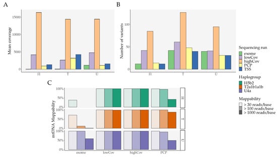Primary analysis: Overall look; variant threshold was set at 0.4% for exome, lowCov, and highCov, and 2.5% for PCP. (A) Mean coverage per sample and per sequencing run/pipeline; (B) Number of variants per sequencing run/pipeline; (C) Mappability and haplogroup assignment per sequencing run/pipeline (TSS is not shown since it does not output raw data). Error bars denote standard error of the mean (SEM). Abbreviations: PCP—PrecisionCallerPipeline; TSS—Ion Torrent Suite™ Software.