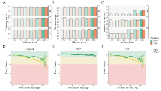 Ion Torrent sequencing: Overall look at differences between PCP and TSS; a 0% mixture level denotes unmixed samples. (A) Total number of sequences per pipeline and major sample contributor; (B) Mean coverage per pipeline and major sample contributor; (C) Number of variants per pipeline and major sample contributor; (D–F) MultiQC’s Phred score per base pair in the unprocessed FASTQ files, PCP’s BAM to FASTQ files, and TSS’s BAM to FASTQ files, respectively. Abbreviations: bp—base pair; PCP—PrecisionCallerPipeline; TSS—Ion Torrent Suite™ Software.
