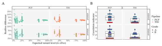 Mixture analysis: similarity in Grade A/B variants between expected and observed variant levels, for internal and external comparisons, per pipeline. (A) Relative difference between expected and observed variant level, per pipeline, and per internal and external comparison; (B) Correlation indicator for internal and external comparisons, per pipeline, and per variant grade. Abbreviations: PCP—PrecisionCallerPipeline; TSS—Ion Torrent Suite™ Software.