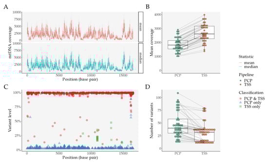 In PCP, genome coverage followed a similar pattern in all samples (Figure 5A), with an overall uniform mappability (Table S25). The genome coverage was also in accordance with what is typical in Ion Torrent™ sequencing with the Precision ID mtDNA Whole Genome Panel []. The haplogroup was identical for both pipelines in 45/50 samples (Table S25). In PCP, 3 samples were flagged for contamination in contrast to TSS, which had 11 samples, 10/11 were well below its ~10% threshold (Table S25). In PCP, the number of variants varied extremely, from 12 to 503, while in TSS, they ranged from 10 to 80 (Table S25). Thus, we eliminated Samples #21, #37, and #44 because of their contamination status, and Samples #2 and #3 because of their extremely high number of variants in PCP, from our subsequent analysis.