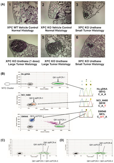 Mouse breeding and urethane carcinogen models were performed as previously published, approved by Indiana University Institutional Biosafety Committee (IBC, IN-972) the Indiana University Animal Care and Use Committee (IACUC Protocol 18104) [14]. Briefly, female mice (Xpc WT and -/-, C57Bl/6;129 background aged six to eight weeks) were treated with urethane (1 g/kg body weight in PBS) or vehicle (PBS) weekly for six weeks. Necropsy was performed at 28 weeks after the initial urethane injection. Lung harvest and bronchoalveolar lavage (BAL) were performed as previously described with one lobe of the right lung frozen in TissueTek Optimal Cutting Temperature (O.C.T.) medium [14]. Human gDNA for ddPCR controls were obtained from Takara and ATCC cell lines (H460, SW948), and were confirmed as mycoplasma-free.