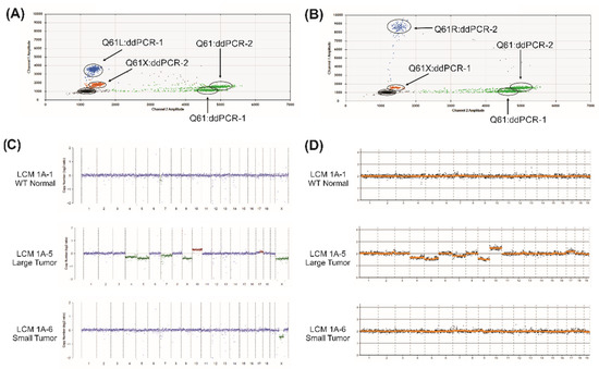 Digital droplet PCR (ddPCR) was used to assess the mutation status and approximate percentage of cells harboring Kras Q61 codon changes. Instead of custom designing mouse primer/probe combinations, we explored the use of commercial Bio-Rad human Kras Q61 primer/probes designed for ddPCR. Looking at the homology of the human and mouse gDNA sequences in this region showed 100% identity 5′ and 3′ to Q61 for a length greater than expected to be needed in the ddPCR design. In addition, work by others has indicated aberrant ddPCR signals with sequence mismatches nearby the designed probe nucleotide position [16,17]. To ascertain these complexities, human lung cancer cell line control gDNAs were tested (Figure 1B). Each primer/probe assay is designed to detect a specific Kras Q61 mutation (Q61L, Q61R, Q61H 183A>T, Q61H 183A>C). In order to differentiate the assays more clearly from the mutations detected by each assay, we will subsequently refer to the primer/probe assays as ddPCR-1 through ddPCR-4, respectively, as detailed in Section 4. By way of example using ddPCR-1 (Bio-Rad Q61L primer/probe), human control gDNA found only signal in channel 2 (green, HEX) indicating only the wild-type (WT) Q61 CAA codon (Q61) was detected. Using ddPCR-1, the SW948 cell line gDNA (heterozygous Q61L, CaA->Ca/tT) produced strong WT (green, HEX), mutant (blue, FAM), and double-labelled droplets (purple) signals. Again, using ddPCR-1, NCI-H460 cell line gDNA (homozygous Kras Q61H, CAa->CAt) generated a strong aberrant signal (orange; Q61X), slightly offset from the no template control (NTC) signal with no detectable WT Q61 present. This was confirmed by ddPCR-3 to represent the expected Kras Q61H mutation (data not shown). Thus, the aberrant signal (orange; Q61X), slightly but reproducibly offset from the NTC signal, indicates a mutation nearby to the designed probe position. We then tested four different Q61 primer/probes (ddPCR-1 to ddPCR-4, as in Section 4) on the two normal histology LCM amplified mouse gDNA preparations (samples 1A-1 and 1A-2). In both cases, the normal histology LCM gDNA samples only contained the WT Kras Q61 sequence (Figure 1C,D).