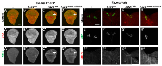 Induction of UPR observed in wing imaginal discs and larval IPCs harboring the ectopic expressing human mutant preproinsulin. (A–D) Xbp1-GFP fluorescence (green in (A–D), white in (A”–D”), arrows in (C,C”) and (D,D”)) produced because of ER stress-dependent splicing of Xbp1*-GFP mRNA in wing imaginal discs. Red in (A–D) (white in (A’–D’)): DNA staining. (A–A”) A control wing imaginal disc (Bx-Gal4/+; UAS-Xbp1*-GFP). (B–B”). A wing imaginal disc expressing hINSWT in the wing pouch region (Bx > hINSWT, Xbp1*-GFP). (C–C”) A wing imaginal disc expressing hINSC96Y (Bx > hINSC96Y, Xbp1*-GFP). (D–D”) A wing imaginal disc expressing hINSLB15YB16delinsH (Bx > hINSLB15YB16delinsH, Xbp1*-GFP). Scale bar: 100 μm. (E–H) Anti-GRP78 immunostaining (red in (E–H), white in (E”–H”)) of brains the ectopically expressing GFPnls in IPCs from third-instar larvae. IPC nuclei are visualized by GFP expression (green in (E–H), white in (E’–H’)). (E–E”) A control larval brain (ilp2 > GFPnls). (F–F”) A Larval brain with IPC-specific expression of hINSWT (ilp2 > hINSWT, GFPnls). (G–G”) A Larval brain expressing hINSC96Y in IPCs (ilp2 > hINSC96Y, GFPnls). (H–H”) A Larval brain expressing hINSLB15YB16delinsH in IPCs (ilp2 > hINSLB15YB16delinsH, GFPnls). Insets in (G”) and (H”) present a magnified view of the IPC cluster. Scale bar: 50 μm.