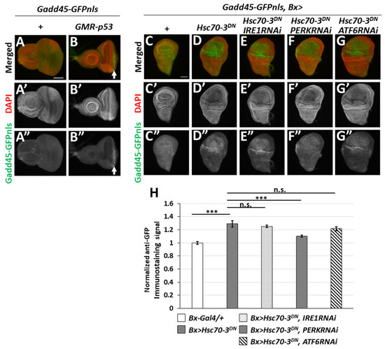 Thus, we next examined whether the ER stress-induced expression of the GFP reporter was observed. As previously described, the ectopic expression of a dominant-negative mutant of Drosophila ER chaperone (Hsc70-3DN) is a known ER stress inducer [27]. We observed a strong GFP fluorescence in the wing pouch region expressing Hsc70-3DN in wing discs using Bx-Gal4 driver (Gadd45-GFP, Bx > Hsc70-3DN), indicating that Gadd45 expression was induced. By contrast, no GFP signals in the control wing discs (Bx-Gal4/+; Gadd45-GFP/+) (Figure 2C,D,H). These results suggested that Gadd45 is an UPR target gene whose expression is also induced in response to ER stress, other than DNA damage.