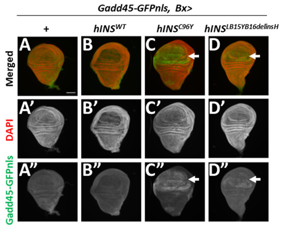 To assess whether the human mutant preproinsulins induce the UPR in a response to the ER stress, we next investigated whether the ectopic expression of hINSC96Y and hINSLB15YB16delinsH induced transcription of the Gadd45 gene using the GFP reporter. No GFP signal was observed in the control wing imaginal discs (Gadd45-GFP, Bx-Gal4/+) (Figure 3A,A”). Similarly, the expression of hINSWT failed to induce GFP fluorescence, indicating induction of Gadd45 transcription in the wing pouch region of the imaginal discs (Figure 3B,B”). In contrast, the GFP signal was detected in the pouch region expressing hINSC96Y and hINSLB15YB16delinsH (Gadd45-GFP, Bx > hINSC96Y and Gadd45-GFP, Bx > hINSL39Y40delinH, respectively) (Figure 3C,C”,D,D”). The GFP signal in the discs expressing hINSC96Y was more intense than that in hINSLB15YB16delinsH. These results indicate that ER stress associated with the expression of human mutant preproinsulin induced Gadd45 transcription.