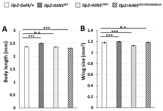 Next, we assessed the effect of human mutant preproinsulin-overexpression in IPCs on the overall Drosophila growth. The average body length of the male flies with continuous hINSLB15YB16delinsH expression in IPCs significantly decreased by 2.2% compared with that of the controls (n = 69). In contrast, the differences in body lengths between the hINSC96Y group and the controls were not significant (n = 79) (p > 0.05, Student’s t-test, Figure 4A). Furthermore, the whole wing size of ilp2 > hINSC96Y adult males decreased by 4.4%, compared with the controls (n = 125). However, the differences between the wing of hINSLB15YB16delinsH males and the controls were not statistically significant (n = 113) (p > 0.05, Student’s t-test, Figure 4B). These data collectively suggested that the expression of the human mutant preproinsulin in IPCs resulted in partial growth inhibition of the organisms.
