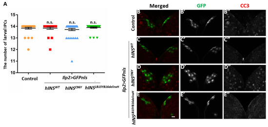 The ectopic expression of neither of hINSC96Y or hINSLB15YB16delinsH induced caspase activation or the loss of larval IPCs. (A) The number of larval IPCs in control larvae and larvae expressing human preproinsulin at the third-instar stage. Note that the differences in the IPC number between larvae expressing every three types of preproinsulin and control larvae (ilp2 > GFPnls) were not significant (n > 25, n.s.: not significant, Mann–Whitney’s U-test). (B–E) Immunostaining of third-instar larval brains having IPCs labeled with GFPnls with anti-Cleaved Caspase-3 (CC3) antibody. Red in B–E (white in (B”–E”)): Anti-CC3 immunostaining signal. Green I n (B–E) (white in (B’–E’)): IPCs visualized by expression of GFPnls. (B–B”) Control larval brain (ilp2 > GFPnls). (C–C”) Larval brain the ectopic expressing hINSWT in IPCs (ilp2 > hINSWT, GFPnls). (D–D”) Larval brain with IPCs-specific expression of hINSC96Y (ilp2 > hINSC96Y, GFPnls). (E–E”) Larval brain with IPCs-specific expression of hINSLB15YB16delinsH (ilp2 > hINSLB15YB16delinsH, GFPnls). Scale bar: 10 μm.