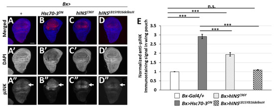 The JNK pathway is a widely known key mediator for the transduction of stress-related signals, and thereby for apoptosis induction. We had previously reported that the ER stress by Hsc70-3DN expression induced apoptosis dependent on this pathway [27]. To further understand the mechanisms by which the ER stress led to apoptosis induction, we examined whether expression of the human mutant polypeptides activated the JNK pathway. First, we performed immunostaining of wing discs expressing Hsc70-3DN with an antibody recognizing a phosphorylated JNK (pJNK). We observed a weak striped pattern signal of pJNK, which corresponded to a known developmental signal in the control wing discs (Bx-Gal4/+) (arrows in Figure 6A,A”,E) [31]. By contrast, a much more intense pJNK signal was observed in wing discs expressing Hsc70-3DN (Bx > Hsc70-3DN) (arrow in Figure 6B”,E). Moreover, we examined whether the pJNK immunostaining signal was observed in the wing discs expressing normal or the mutant types of human preproinsulin; in those expressing the normal human peptide (Bx > hINSWT), an enhanced signal over the basal levels was not observed (data not shown). In contrast, we found relatively weak pJNK signal in the wing pouch region expressing hINSC96Y (Bx > hINSC96Y). The pJNK signal was less robust than the signal in the Hsc70-3DN-expressing region, but it was significantly higher than that in the discs of the control flies (arrows in Figure 6A”,C”,E). Similarly, the signal in the wing discs expressing hINSLB15YB16delinsH (Bx > hINSLB15YB16delinsH) was faint, but slightly higher than that in the control discs (arrows in Figure 6A”,D”,E). These results suggested that the ER stress induced by two human mutant preproinsulins could result in the weak activation of the JNK pathway, but the level was not strong enough to induce apoptosis in Drosophila tissues.