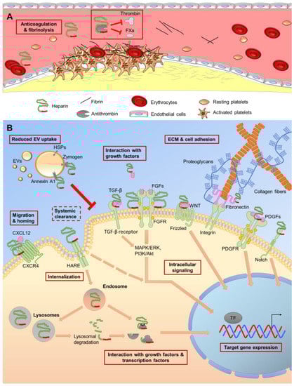 Overview of intravascular, extracellular and intracellular effects of heparin. (A) In the blood stream, the anticoagulant effect of heparin results from binding to antithrombin amplifying inhibition of activated factor Xa (FXa) and thrombin. (B) In the extracellular and intracellular environment, heparin affects essential cell functions such as ECM formation, cell adhesion and migration. The interaction with the extracellular matrix (ECM), but also growth factor receptors as transforming growth factor (TGF)-beta receptor, fibroblast growth factor receptor (FGFR) Frizzled, Notch and platelet derived growth factor receptor (PDGFR) activates divergent intracellular signaling pathways, putatively affecting gene expression. A systemic clearance of heparin by cellular internalization and lysosomal degradation may finally induce the expression of target genes. Furthermore, the cellular uptake of extracellular vesicles (EVs) can be reduced by heparin, putatively influencing cell-to-cell communication.