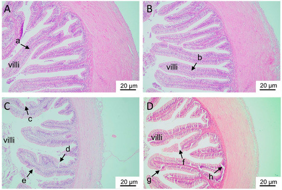 Histological analyses of the intestinal tissues of yellow catfish fed four experimental diets. (A) The control. (B) 50 mg/kg nano-ZnO group. (C) 100 mg/kg nano-ZnO group. (D) 100 mg/kg nano-ZnO + TPEN group. In (A,B), the intestinal villi were complete, full, and intact (arrows a and b). In (C,D), the villi showed injury, notching and vacuoles (arrows c–h).