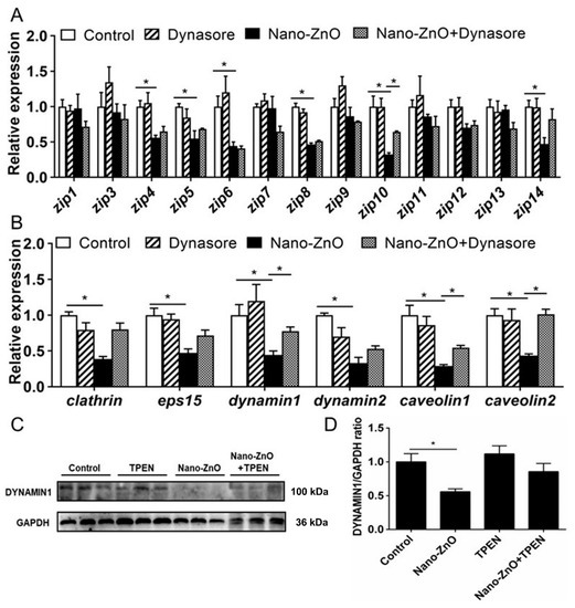 Effects of Nano-ZnO and Dynasore incubation on expression of genes and proteins involved in Zn absorption and transport of yellow catfish IECs. (A) The mRNA expression of Zn transport protein. (B) The mRNA expression of endocytosis genes. (C) Dynamin1 protein levels. (D) Quantification of Dynamin1 protein level. Different letters or asterisks (*) indicate the significant differences between the two groups (p < 0.05). For each value, three biological replicates are undertaken.