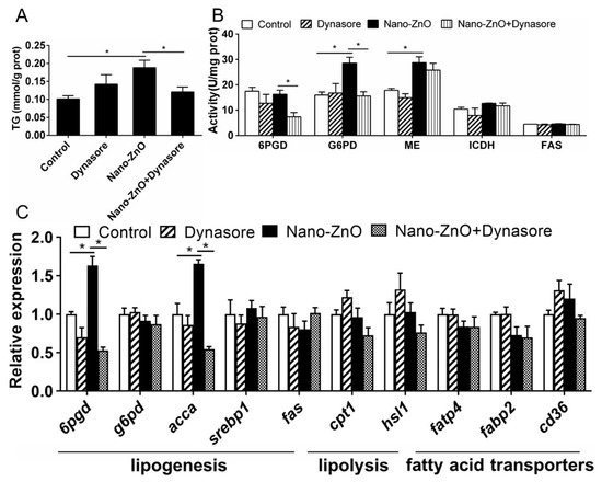 Effects of Nano-ZnO and Dynasore incubation on TG contents, enzymatic activities, and gene expression of yellow catfish IECs. (A) TG content. (B) Enzyme activities. (C) The mRNA expression of lipid metabolism genes. Asterisks (*) indicate the significant differences between the two treatments (p < 0.05). For each value, three biological replicates are undertaken.
