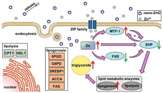 In our study, dietary nano-ZnO increased the Zn and TG contents and promoted lipogenesis in the intestine. The high uptake rate of nano-ZnO may be attributed to multiple absorption pathways. The nanoparticles were absorbed into intestinal epithelial cells via the endocytosis pathway, while Zn2+ released from nano-ZnO was absorpted by the ZIP system. The lipogenesis effects of nano-ZnO probably depended on the key gene SHP, which was regulated by MTF1 and/or FXR (Figure 8). We have provided evidence that a novel regulatory pathway consisting of MTF-1/SHP is critical to the regulation of nano-ZnO-induced lipid deposition. This work provides new evidence for understanding the mechanisms associated with the lipotoxic effects ascribed to dietary nano-ZnO. However, considering that the characteristics of nano-ZnO are influenced by its size and morphology, we should remain cautious of extrapolating the present study to other nanoparticles.