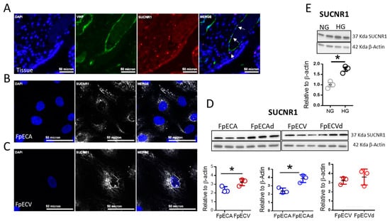 SUCNR1 expression in human full-term placental endothelial cells. (A) ISH combined with immunofluorescence staining of human full-term placenta. Tissue sections were stained with a probe against SUCNR1 and antibody against VWF as a marker for endothelial cells. Nuclei were counterstained with DAPI. Three sections from each placenta were examined and the shown image is representative for 5 normal placentas (n = 5). White arrows show co-expression of SUCNR1 and VWF. (B,C) Immunofluorescence staining of FpECAs and FpECVs, respectively, using antibody against SUCNR1 and DAPI for counterstaining. Images are representative for 3 different isolations (n = 3). (D) Western blot of SUCNR1 in isolated placental arterial and venous cells from GDM and normal pregnancies (n = 3). (E) Western blot of SUCNR1 in primary HUVECs cultured in normal or high glucose for 48 h (n = 3). For (D), unpaired t-test was used between groups, * p < 0.05, data are shown as mean ± SD (n = 3). For (E), paired t-test was performed, * p < 0.05, data are shown mean ±SEM. Representative images and densitometry analysis are shown for (D,E).