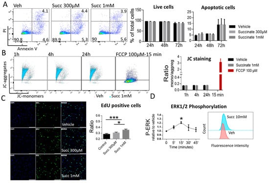 Succinate Induces proliferation but Not apoptosis of HUVECs. (A) Annexin V/PI staining of HUVECs treated either with vehicle or succinate. The percentages of apoptotic and live cells were calculated at 24, 48 and 72 h. (B) JC-1 staining of HUVECs treated with vehicle or succinate. FCCP, a mitochondrial membrane uncoupler, was used as a positive control. The ratio of JC monomers to aggregates was calculated from median fluorescence intensity at 1, 4 and 24 h. For A and B, representative flow cytometric dot plots are shown, data are mean ±SEM, (n = 3). (C) EdU proliferation assay of HUVECs treated with vehicle or succinate. At least 5 different fields per slide were examined and the ratio of EdU positive cells to the total number per field was calculated. Representative image is included (scale bar 200 µm). (D) ERK1/2 phosphorylation in EA.hy926 cells in response to succinate. Data are expressed as fold change in fluorescence intensity relative to vehicle. Representative histogram is shown. (C,D) were analyzed with one-way ANOVA followed by Tukey’s post hoc test, * p < 0.05, *** p < 0.001. Data are shown as mean ±SEM (n = 3-5).