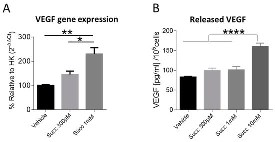Succinate induces VEGF gene expression and release in HUVECs. (A) RT-PCR of HUVECs treated with vehicle or succinate for 4 h. (B) VEGF ELISA in culture supernatant of HUVECs treated with vehicle or succinate for 24 h. For A and B, one-way ANOVA followed by Tukey’s post hoc test was performed, * p < 0.05, ** p < 0.01, **** p < 0.0001, data are shown as mean ±SEM (n = 4–5).