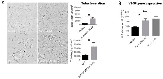 Based on the aforementioned observations in HUVECs and being aware of the differences between venous and arterial cells [], we investigated whether FpECAs showed an angiogenic response to succinate in a comparable manner as in HUVECs. With fibrin tube formation assays, we showed that FpECAs readily responded to low succinate concentration (30 µM). Tube length was significantly higher with succinate used alone or in combination with the positive control bVT (b-Fibroblast growth factor, VEGF and TNF-α) as depicted in Figure 7A. RT-PCR of FpECAs showed that like in HUVECs, treatment with succinate (300 µM and 1 mM) for 4 h significantly induced VEGF gene expression (Figure 7B).