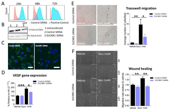 To investigate the specificity of our previous findings in HUVECs, we knocked down SUCNR1 using an SiRNA approach. We performed flow cytometric analysis of DY-547 labeled positive control SiRNA and our data showed the presence of SiRNA inside the cells at 24, 48 and 72 h (Figure 8A). We confirmed the knockdown efficacy at the protein level by Western blot and immunofluorescence staining of the receptor in control and SUCNR1 SiRNA-transfected cells at 72 h (Figure 8B,C). Functionally, knockdown of SUCNR1 significantly reduced VEGF gene expression in response to 1 mM succinate relative to control SiRNA-transfected cells at 4 h (Figure 8D). Moreover, the number of migrated cells after 16 h in response to succinate in a Transwell migration assay was significantly lower in SUCNR1 SiRNA-transfected HUVECs relative to control SiRNA (Figure 8E). In parallel, the wound healing capacity of SUCNR1 SiRNA-transfected HUVECs in response to succinate was significantly hampered relative to control transfected cells (Figure 8F). Collectively, knockdown of SUCNR1 prevented succinate induced VEGF gene expression, migration and wound closure in HUVECs.