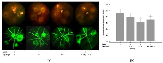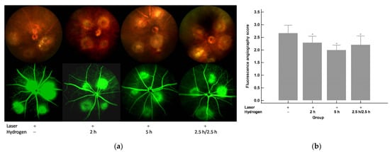 Day 10 (5 days after laser photocoagulation). (a) CFP and FA. (b) FA leakage scores. Significantly lower FA leakage scores were shown after the hydrogen inhalation compared to those without inhalation and the effect was inhalation period related. * p < 0.05 compared with the laser+/hydrogen− group.