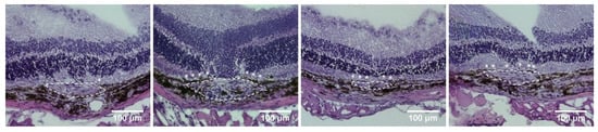 Mice were euthanized on Day 15. Both eyes of each mouse were enucleated and rapidly frozen in embedding medium prior to sectioning. The optic nerve parallel to the sagittal plane at the laser photocoagulation position was selected, and slices with a thickness of 4.0 um were prepared continuously. The sections were stained with HE, observed, and photographed using a light microscope (EVOS M7000 Imaging System, Thermo Fisher, Waltham, MA, USA).
