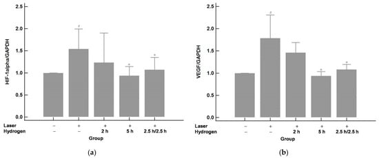 The mRNA expression of HIF-1α (a) and VEGF (b). The expression of HIF-1α and VEGF increased after laser photocoagulation compared with those of the control (no laser or hydrogen inhalation). The elevated HIF-1α and VEGF expression was downregulated by hydrogen inhalation. The effect was similar between the 2.5 h/2.5 h and 5 h groups and showed to be less effective in the 2 h group. # p < 0.05 compared with the control (laser−/hydrogen−) group; * p < 0.05 compared with the laser+/hydrogen− group.