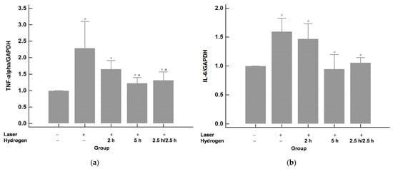 The mRNA expression of TNF-α (a) and IL-6 (b). The mRNA levels of TNF-α and IL-6 were upregulated after laser photocoagulation compared with those of the control (no laser or hydrogen inhalation). The upregulation could be suppressed by hydrogen inhalation. The effects of the 2.5 h/2.5 h and 5 h groups were similar and were more effective than the 2 h group. # p < 0.05 compared with the control (laser−/hydrogen−) group; * p < 0.05 compared with the laser+/hydrogen− group; ● p < 0.05 compared with the laser+/hydrogen 2 h group.