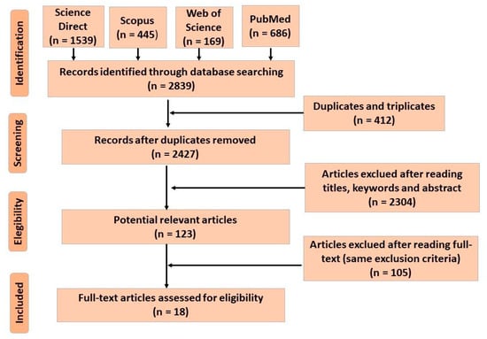 The systematic review results were presented on the PRISMA flow chart illustrated in Figure 1, and Table 1 shows the list of selected articles in which nanoencapsulated NA studies were applied to food. Initially, 2839 articles were identified, of which 412 were duplicated/tripled, leaving 2427. After reading the title, keyword, and abstract, 2304 were excluded, and 123 were selected to read the full text. After careful reading, 105 articles were excluded for not meeting the eligibility criteria (size 1 at 100 nm, application in some food, not application in packaging), and 18 were selected. Other articles were added during the review discussion for further explanation of the subject.