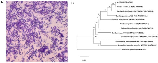 Gram staining and phylogenetic of strain ANSB168. (A) Gram staining of ANSB168 (×630). (B) Neighbor-joining phylogenetic tree based on 16S rRNA gene sequences, showing the phylogeny position of ANSB168 in genus Bacillus. Bootstrap percentages of 1000 replicates are given at branch points, and GenBank accession numbers are given in parentheses. Bar, 1% nucleotide substitutions per 100 nt.